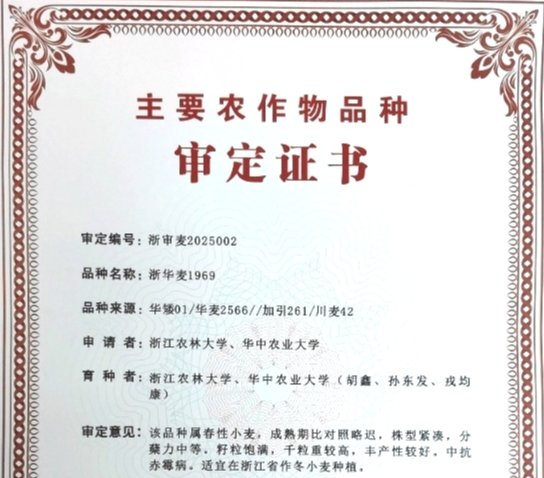 近日,浙江省农业农村厅发布公告(2025第7号),由我院戎均康教授团队自主选育的小麦新品种‘浙华麦1969’通过浙江省农作物品种审定,审定编号为浙审麦2025002。‘浙华麦1969’田间生长整齐,植株中等,穗型较大,着粒较密,穗型纺锤形,壳色为白壳,长芒,粒色红,籽粒硬质。生育期172.4天,株高83.5厘米,亩有效穗28.2万,成穗率59.9%,穗长8.7厘米,每穗实粒数32.3粒,千粒重45.5克,品质表现为优质弱筋,中抗赤霉病。两年区...