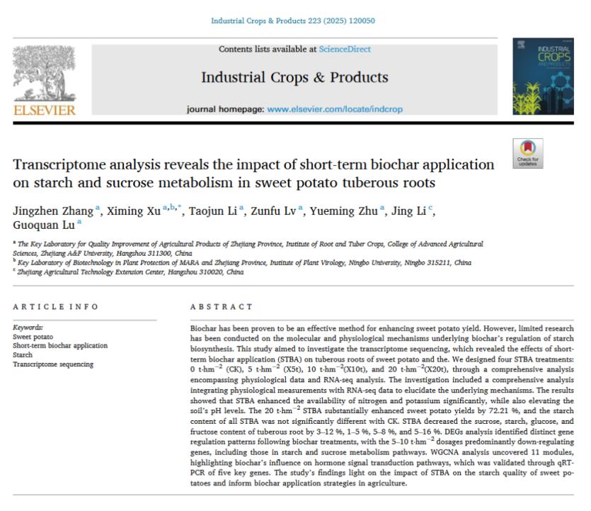 近日,学院智慧农业与薯类作物研究团队在《Industrial Crops & Products》(IF=4.7)上发表了题为“Transcriptome analysis reveals the impact of short-term biochar application on starch and sucrose metabolism in sweet potato tuberous roots”的研究论文。该研究系统探讨了短期生物炭施用对甘薯块根淀粉和蔗糖代谢的影响,为农业实践中生物炭的应用提供了新的理论支持和实践指导。农业有机废弃物的智能回收利用是增强...