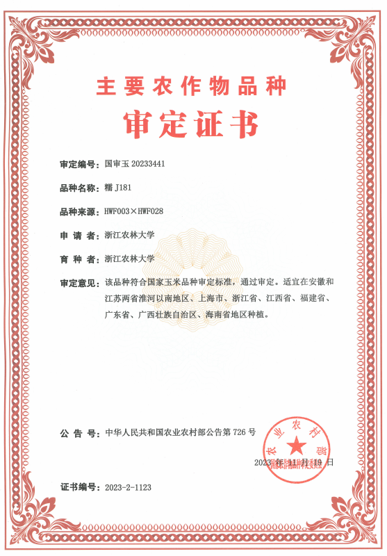 赵光武教授团队长期致力于玉米种质创新与新品种选育工作。该团队以市场和产业需求为导向,坚持传统育种和生物技术的有机融合,统筹协调产量、品质、抗逆性、抗病性等重要性状,先后育成“农林玉1号”“农林玉5号”“惠禾6号”“惠禾7号”“糯J181”“糯J75”等玉米新品种,并在浙江省、海南省、湖北省、山东省、新疆维吾尔自治区等地区建立了玉米新品种示范基地。
