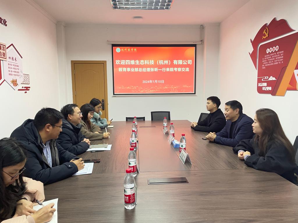 梁卫玲对四维生态科技(杭州)有限公司教育事业部相关人员来访表示热烈欢迎。周国鑫从学院人才培养、教学科研等方面介绍了学院建设发展情况及取得的成就。张昕对学院发展取得的成就表示祝贺,并介绍了四维生态科技的发展过程及高校事业部的基本情况。随后,双方围绕虚拟仿真实验项目建设、特色班/特色课程建设、毕业实习、学生实习、创新创业比赛承办、研究生校外实践导师、智慧农业资讯(育人方向)媒体号运营等方面进行了深入交流。