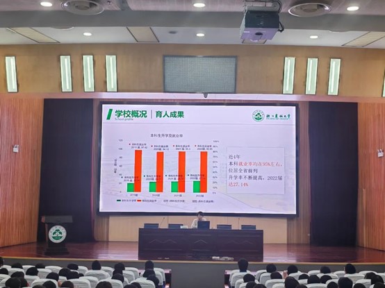 在图书馆第一报告厅,宋春春对学校的基本情况、招生政策进行了介绍,学院优秀本科生代表胡佳铭和研究生代表柯玟欣向同学们分享了校园优美的风景和丰富的大学生活,鼓励同学们树立远大理想,脚踏实地,养成良好的学习习惯和科研精神,朝着目标继续奋斗,并送上美好的祝愿。