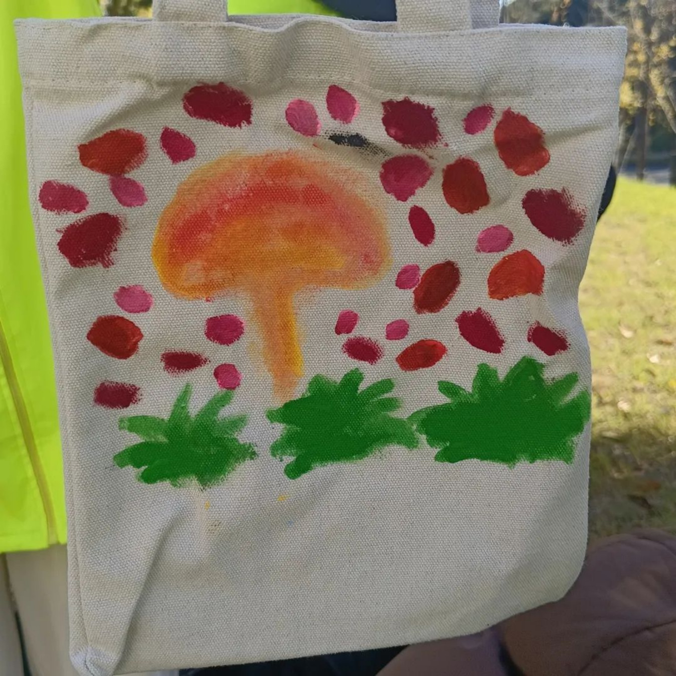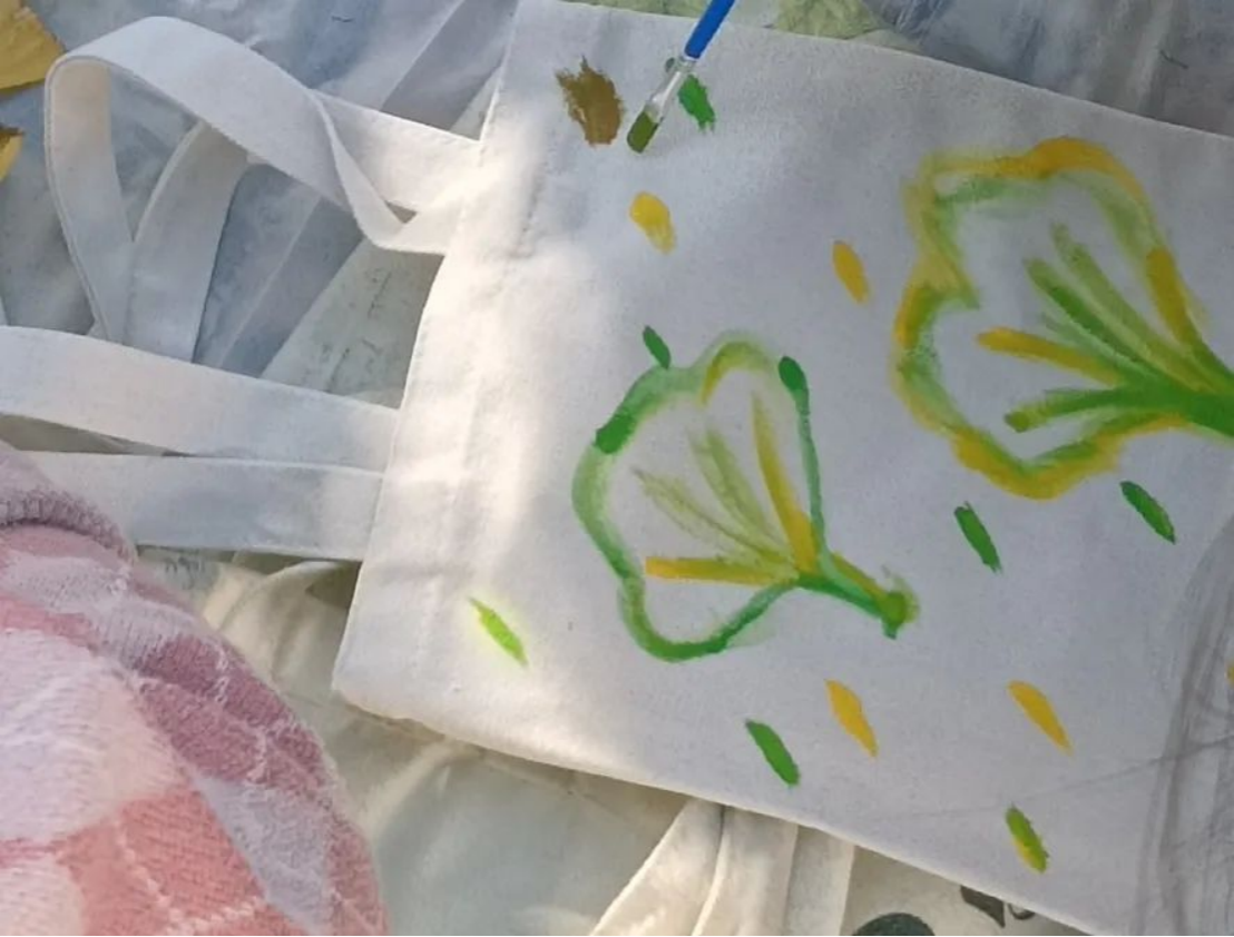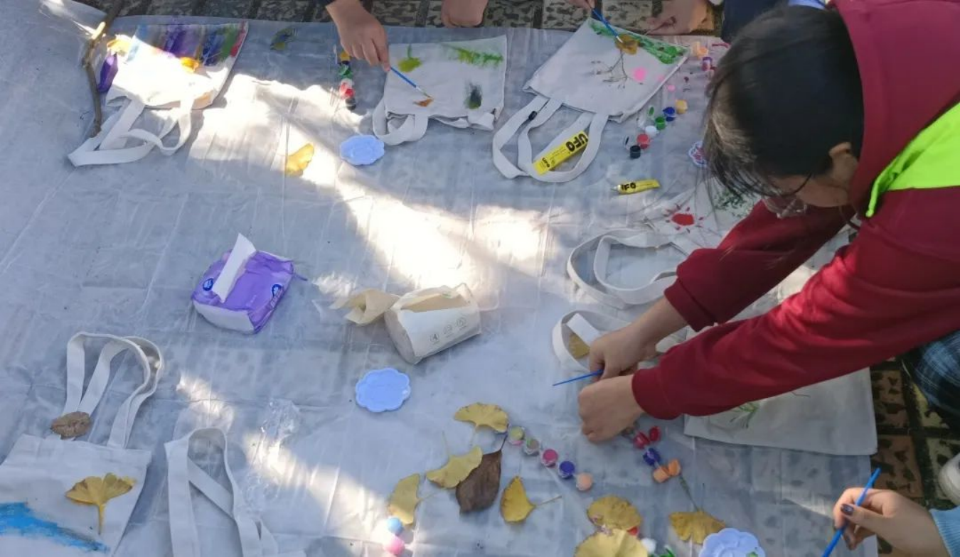 此次活动特色是以自然为画笔绘画帆布袋。同学们结束绿地清扫后,用帆布袋,颜料以及胶水等材料,将自己所想所思用绘画与落叶拓印到帆布袋上,一个个独特的成品彰显同学们丰富的想象力,传递出环保的绿色理念。