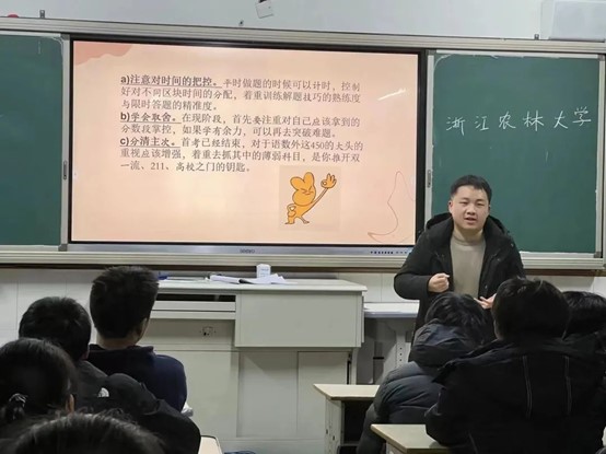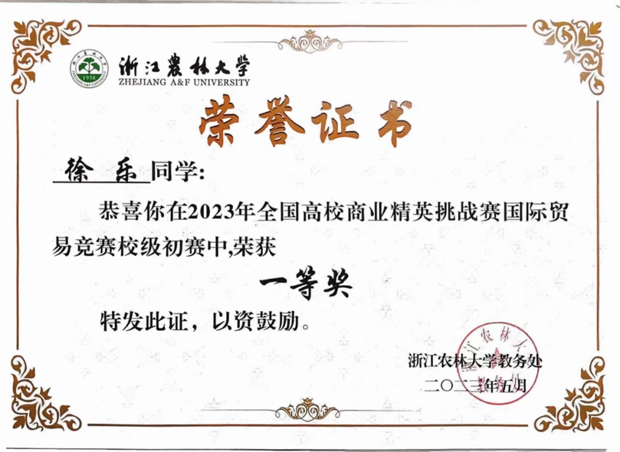 “纸上得来终觉浅,绝知此事要躬行。”在专业知识学习之余,徐乐积极参加各类学科竞赛与社会实践活动,以赛促学,以行促思。入学以来,他以团队负责人等身份参与浙江省大学生乡村振兴创意大赛、大学生化学实验创新设计大赛、浙江省大学生外语能力大赛等学科竞赛10余项,并取得了较为不错的成绩。于他而言,每一次尝试都是一个不小的挑战,但正是秉持着愈挫愈勇的信念,他总是能从比赛中吸取经验教训,并下一次更好地蓄力奋发。光鲜亮丽的背后,暗含着许多坎坷与艰辛,他曾连续多日修改竞赛文本和PPT熬夜到凌晨。他在大一参加的数次大赛,使他积累了实践经验和丰富阅历。在大二,尽管他面临着巨大的压力,但功夫不负有心人,最终他站在了省赛的领奖台上,并以优秀项目团队负责人为来自全省的优秀参赛选手们带来路演。他的竞赛之路仍未停歇,他将为下一个目标而奋斗!