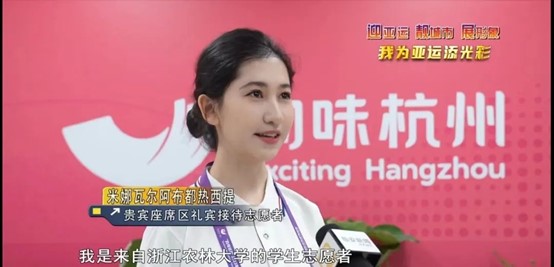 不啻微芒,造炬成阳。亚运会的成功,离不开每一位志愿者的付出。他们聚似一团火,散似满天星,而米娜瓦尔,也是众多星星中的一颗。而她能成为亚运会志愿者之一,离不开体艺对她意志的磨练,对她团队合作精神和责任感的增强。从初步选拔到正式进入亚运场地工作,她不畏艰辛,以苦作舟,尽管身心俱疲,也向外展现着自己最好的姿态。谱绘青春图景,奏响志愿赞歌,助力办好亚运,是她更是每一位“小青荷”的“志”之所向,“愿”之所在。而她作为颁奖礼宾领域和人事领域的一员,不负众望,充满自豪地向各国友人展现了浙农林大学子的风采,展现了“小青荷”的青春力量。