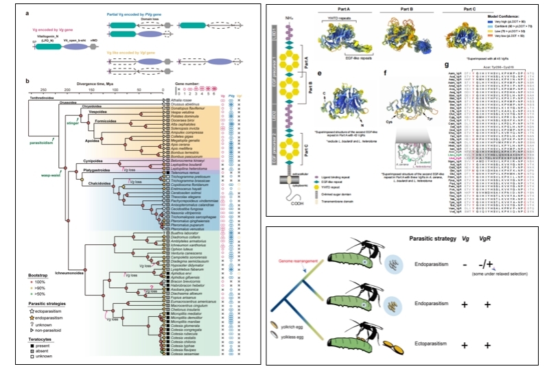 2025年4月16日,学院叶昕海教授团队与浙江大学合作在《美国国家科学院院刊》(简称PNAS,中科院1区Top,5年IF=10.8)上发表题为“Genomic signatures associated with the evolutionary loss of egg yolk in parasitoid wasps”的研究论文,通过比较基因组学手段,解开了困扰学界百余年的内寄生蜂卵黄蛋白演化之谜。