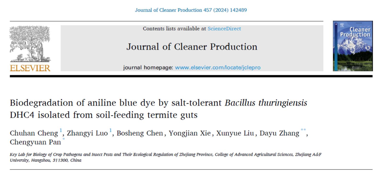 近日,williamhill中国白蚁生物学团队在国际知名期刊《Journal of Cleaner Production》(中科院一区Top,IF5=11)上发表题为"Biodegradation of aniline blue dye by salt-tolerant Bacillus thuringiensis DHC4 isolated from soil-feeding termite guts"的研究论文。学院植物保护学科张大羽教授、潘程远教授为通讯作者,研究生程楚涵为第一作者,骆张怡为共同第一作者。