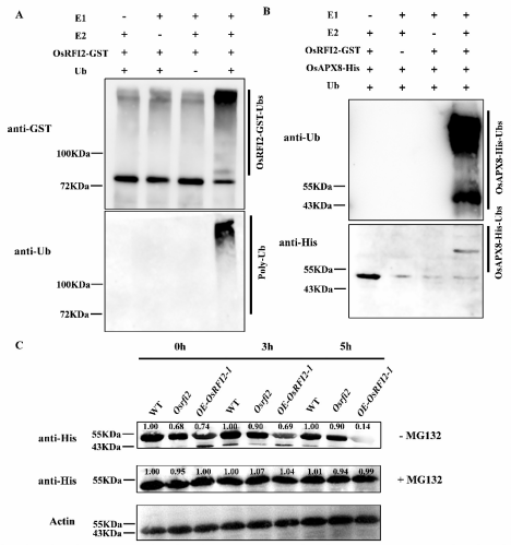 图2 OsRFI2具有E3泛素连接酶活性并通过26S蛋白酶体途径催化OsAPX8泛素化和降解