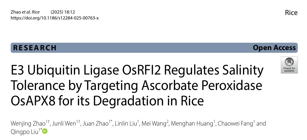 近日,学院作物学科生物信息与作物逆境生理团队在国际知名期刊《Rice》(中科院一区Top)上发表题为"E3 Ubiquitin Ligase OsRFI2 Regulates Salinity Tolerance by Targeting Ascorbate Peroxidase OsAPX8 for its Degradation in Rice"的研究论文。学院作物学科刘庆坡教授为通讯作者,赵娟副教授为共同通讯作者,研究生赵文静为第一作者,温俊丽为共同第一作者。