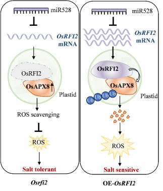 图3 “miR528-OsRFI2-OsAPX8-ROS”调控水稻耐盐性的作用模型