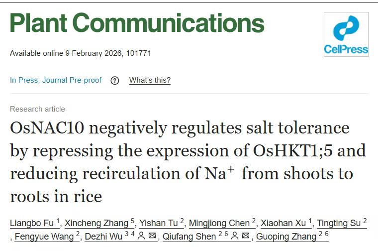 2026年2月9日,williamhill体育中文/浙江大学/湖南农业大学合作团队在国际著名期刊《Plant Communications》 (中科院1区,IF5y=11.8)上发表了题为“OsNAC10 negatively regulates salt tolerance by repressing the expression of OsHKT1;5 and reducing recirculation of Na+ from shoots to roots in rice”的研究论文。该研究首次揭示转录因子OsNAC10在水稻耐盐中的负调控作用,通过抑制钠离子转运蛋白基因OsHKT1;5的表达,削弱水稻的耐盐能力。基于这一机制,联合团队进一步创制出耐盐水稻种质,为作物耐盐遗传改良提供了理论依据与技术支撑。