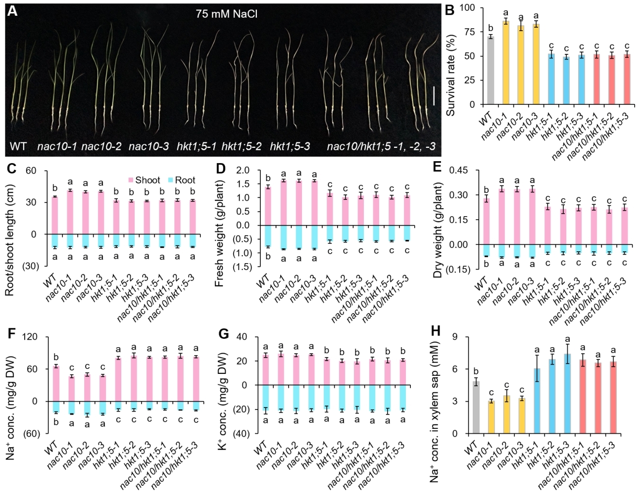 图一、水稻OsNAC10和OsHKT1;5在盐胁迫下的表型图