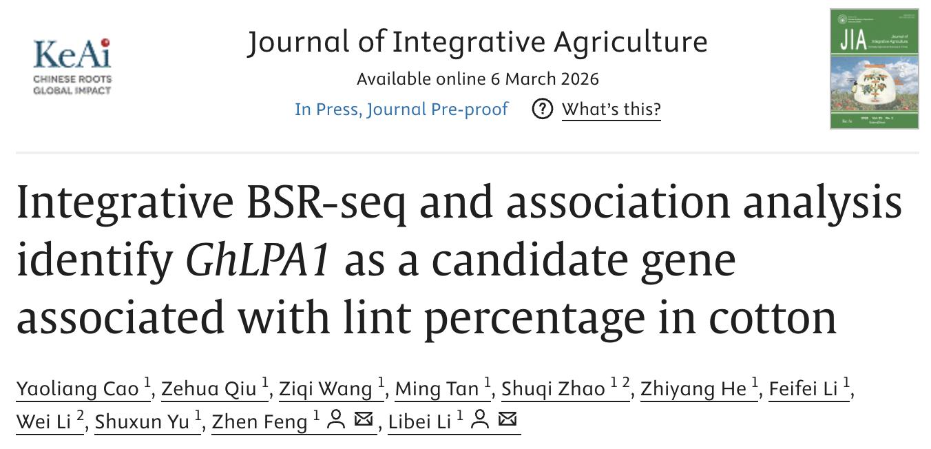 棉花遗传育种团队在 《Journal of Integrative Agriculture》期刊发表研究论文
