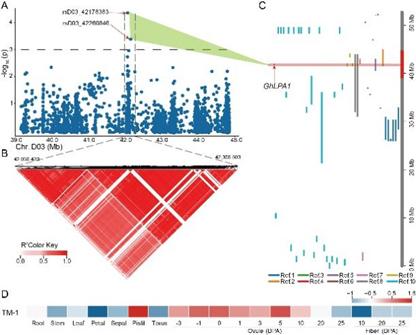 该研究以中棉所50’‘CRI50’)和标准系材料‘TM-1’为亲本,构建了包含300个家系的重组自交系(RIL)群体。基于极端表型混池的转录组测序(BSR-seq)与全基因组关联分析(GWAS)相结合,并联合QTL热点区间分析在D03染色体上定位到一个衣分相关主效QTLqLP-D03-1)。通过病毒诱导基因沉默(VIGS)实验表明该基因在衣分形成过程中发挥正向调控作用。基于GhLPA1基因 的关键SNP位点,研究团队开发了竞争性等位基因特异性PCRKASP)标记,可有效区分不同衣分表型的基因型,为分子标记辅助育种提供了理论依据