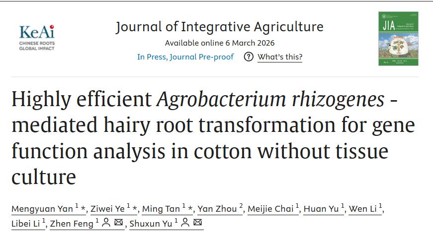 近日,我院棉花遗传育种团队在国际知名农业期刊《Journal of Integrative Agriculture》(中科院1区,IF5y=4.8)发表题为“Highly efficient Agrobacterium rhizogenes -mediated hairy root transformation for gene function analysis in cotton without tissue culture“Integrative BSR-seq and association analysis identify GhLPA1 as a candidate gene associated with lint percentage in cotton”的研究论文。
